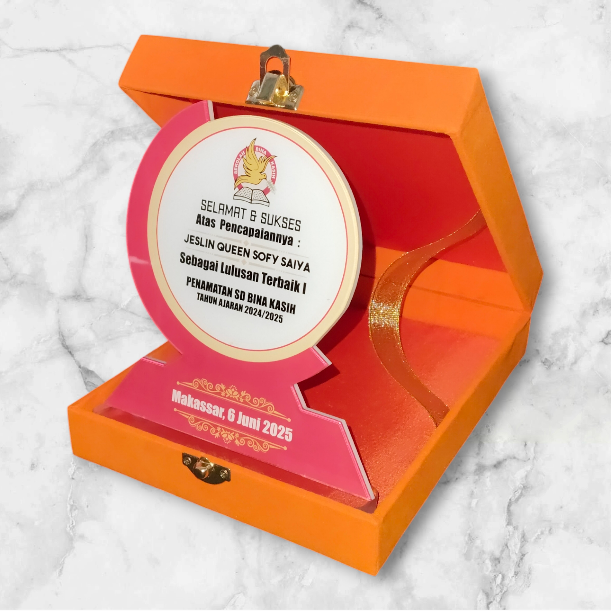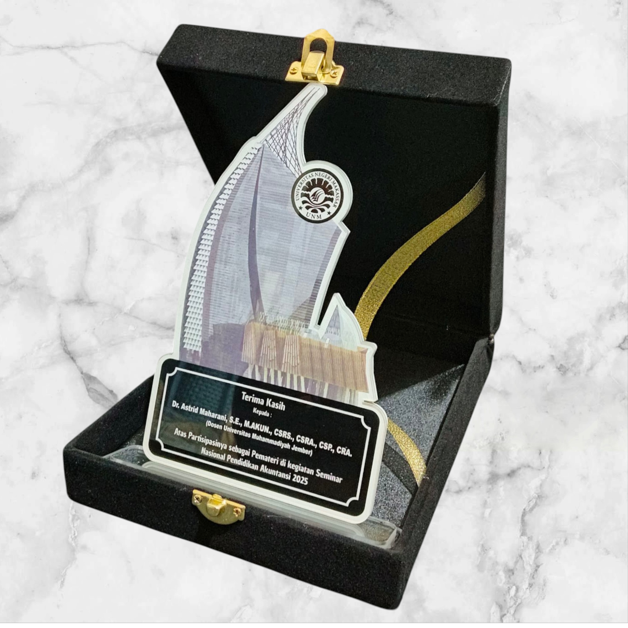 Plakat cenderamata berbahan acrylic di buat dengan proses cutting laser dengan presisi tinggi.
