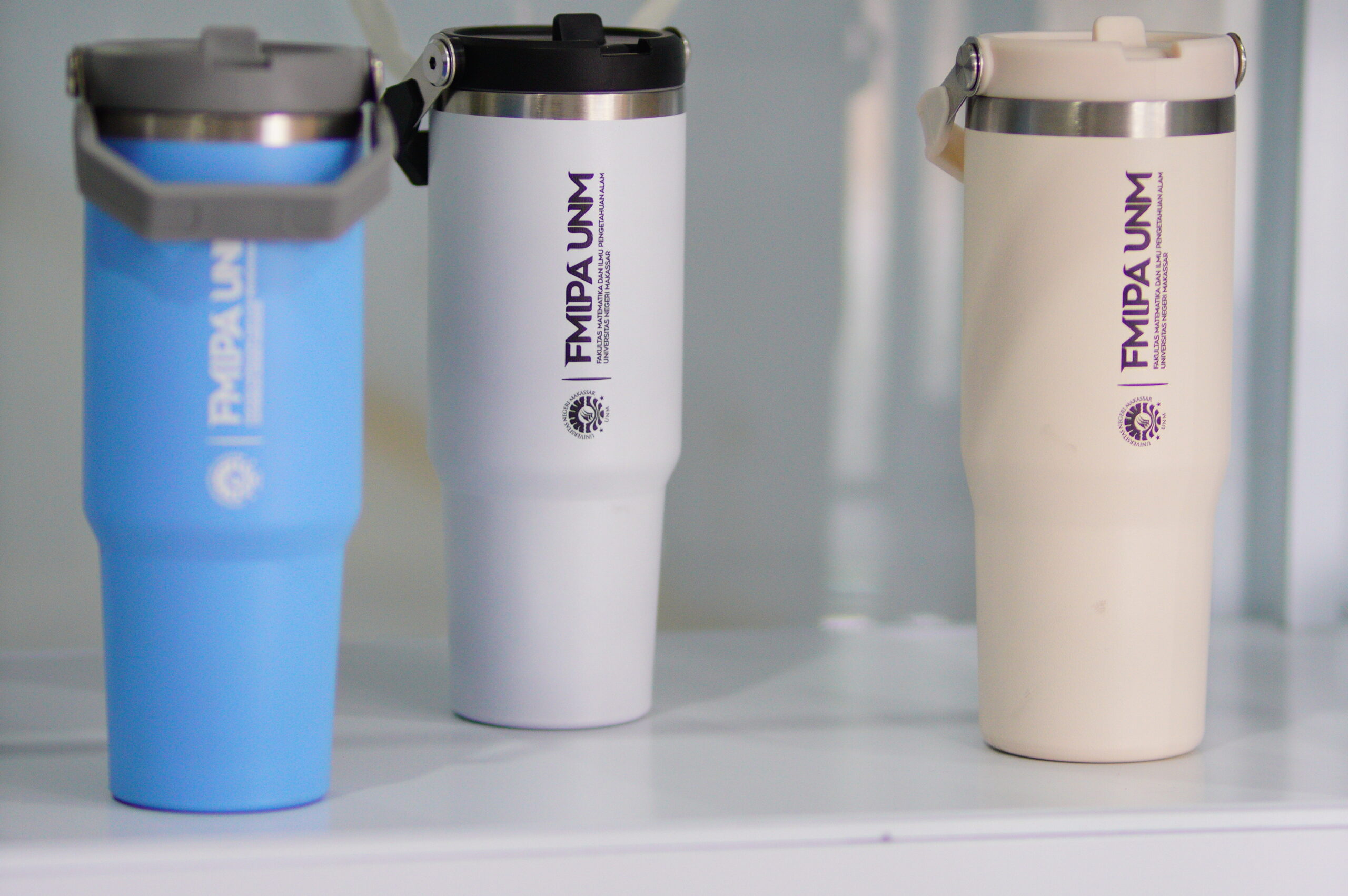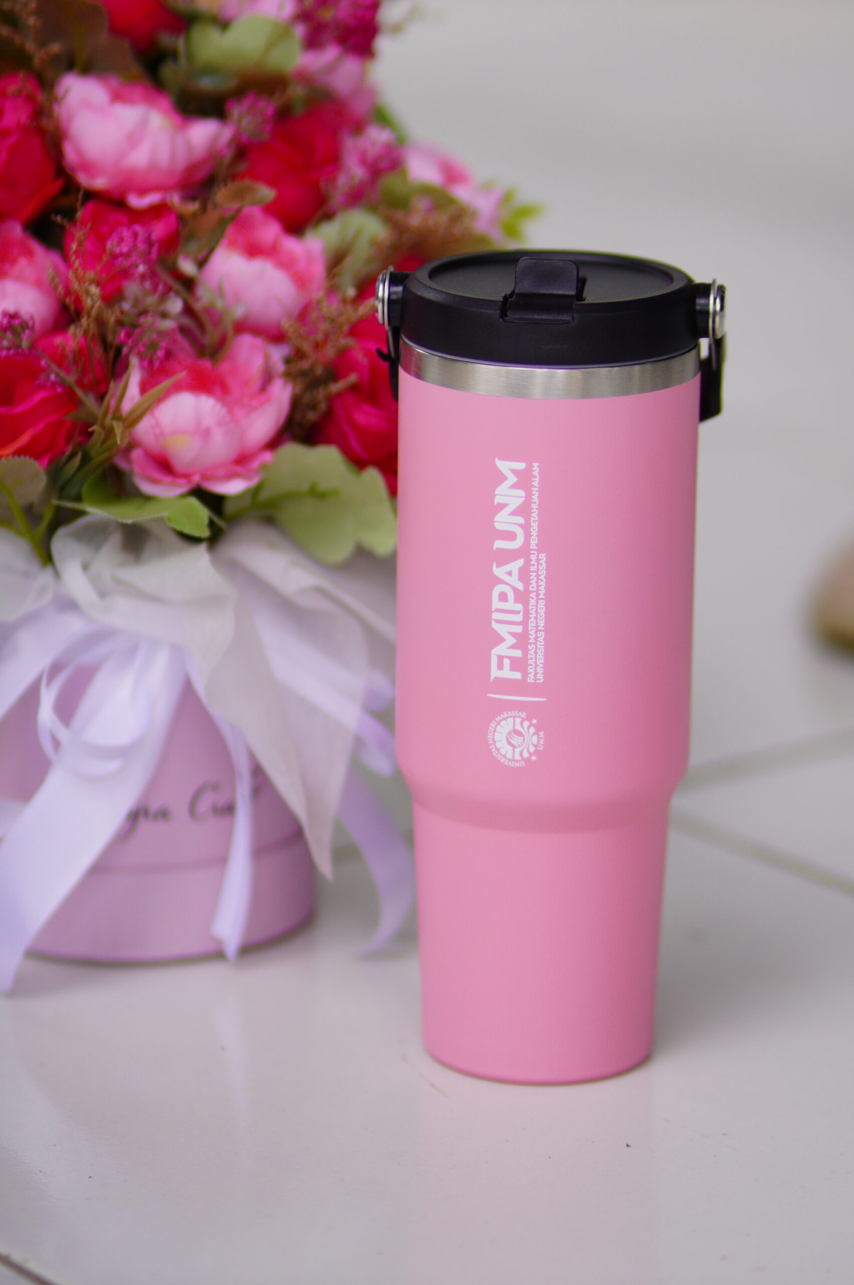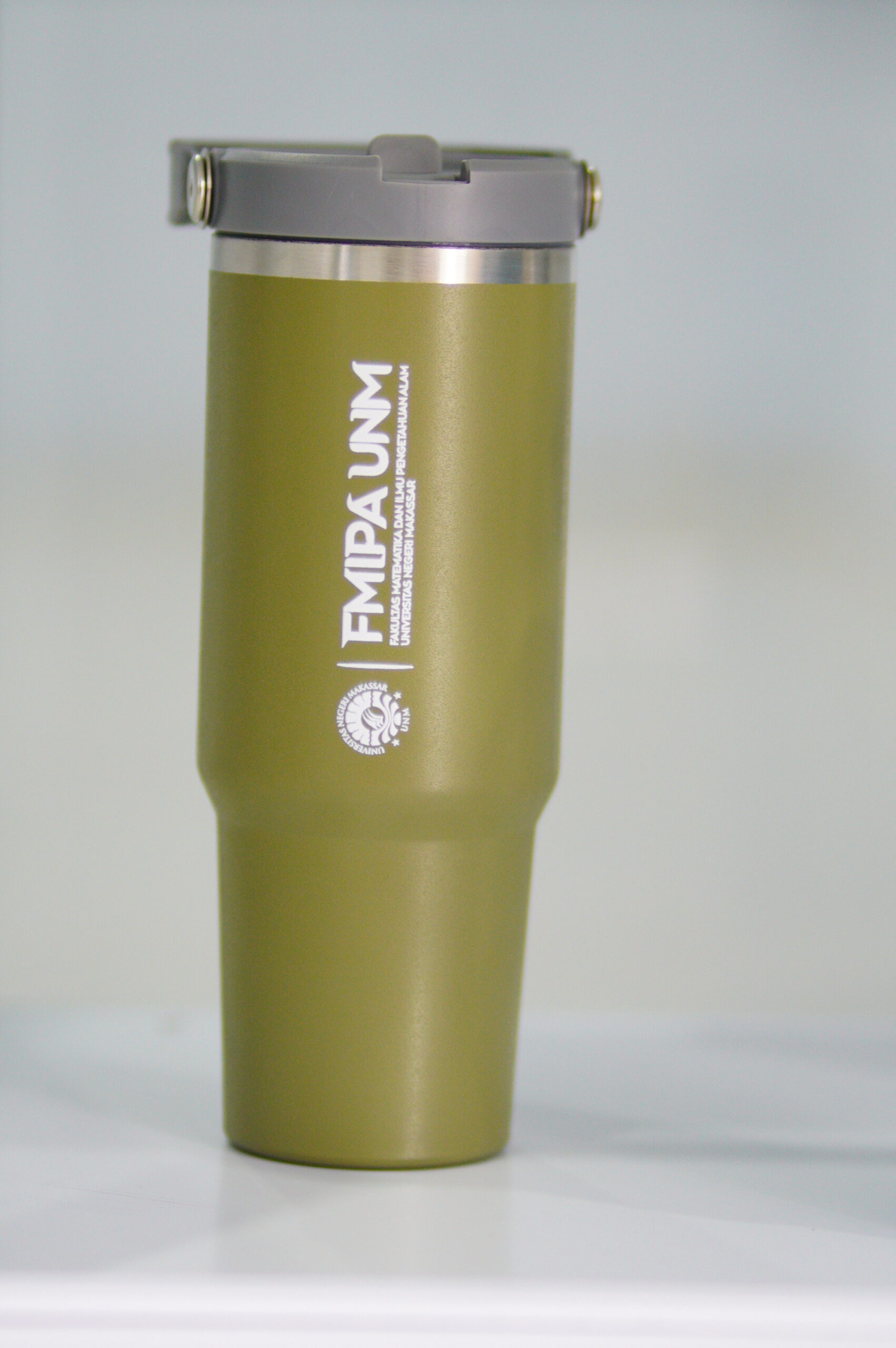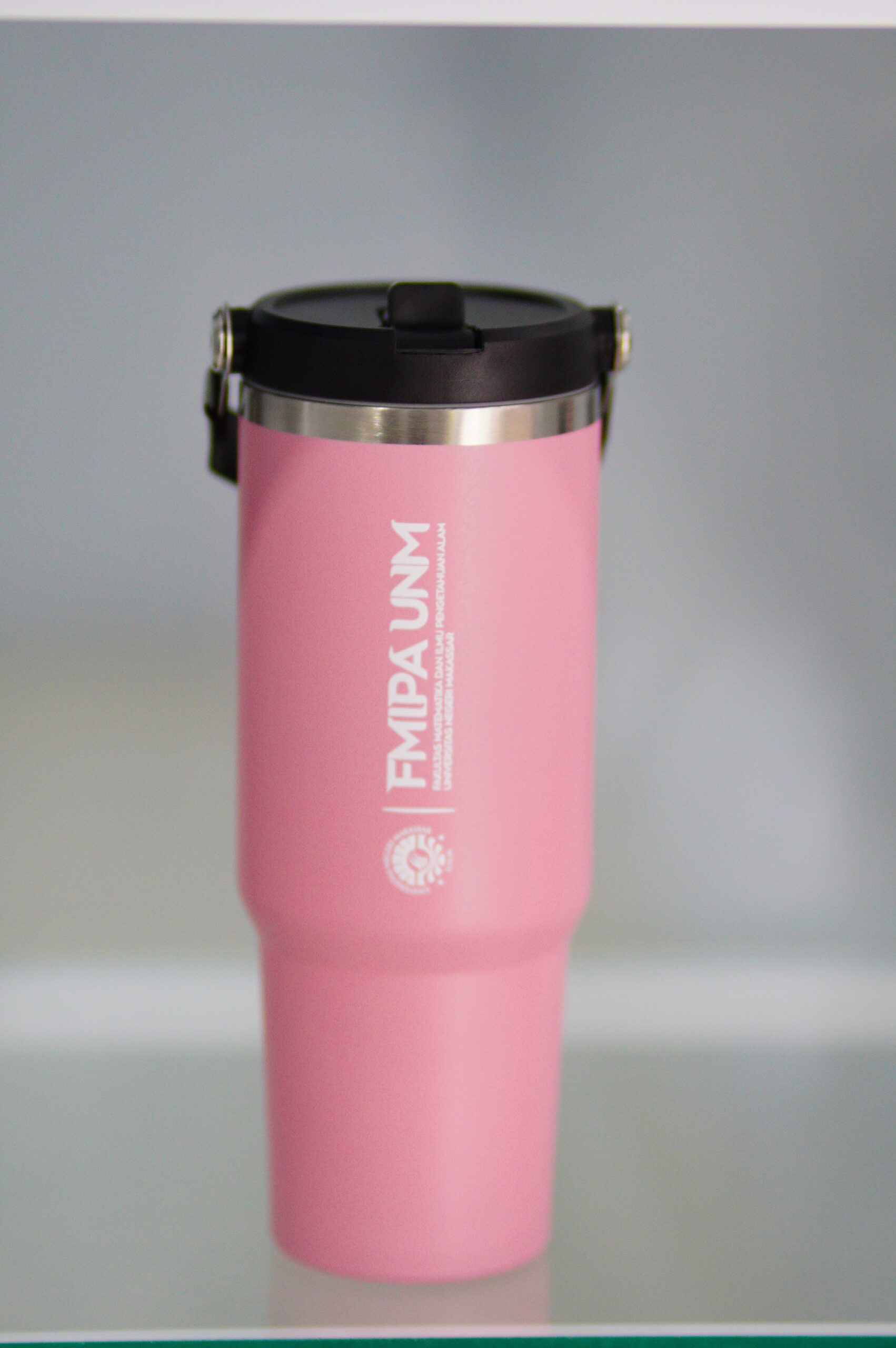 Tumbler Stainless steel FMIPA dengan kapasitas 890mL tahan panas dan dingin +- 12 Jam. Cocok untuk dibawa kemana-mana dengan handle yang panjang.